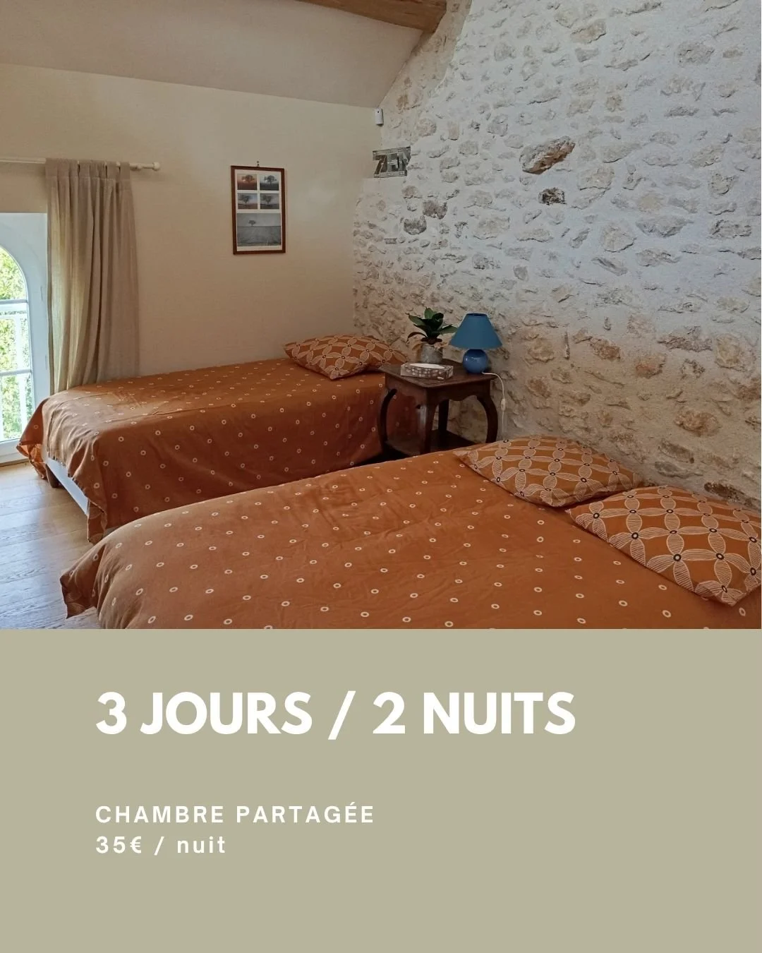 360€ avec hébergement en chambre partagée avec douche et toilette privatifs (2 nuits)